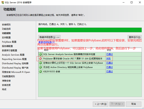 因上一步中选择了对应需要安装的功能,此步骤将进行相关的依赖检查。如下,因polybase 要求JRE7(51)及以上版本,因此本步骤检测未通过,如果不需要,但会上一步去掉该功能,如果需要,则安装后点击重新运行。jre的安装很简单,本文不再赘述。