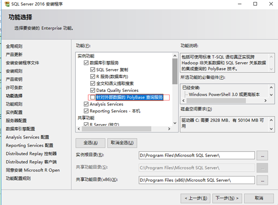 按需选择需要安装的功能,注意此步骤中设计polybase,建议初学者不选择,但是如果有需要用到配合使用Hadoop进行数据分析的进行安装。