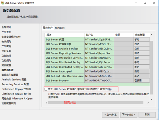 为指定的服务配置账户及排序规则,SQL SERVER2016 自动配置的账户名,默认的即可,如果是SQLSERVER2008 则手动选择对应的账户即可。