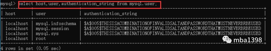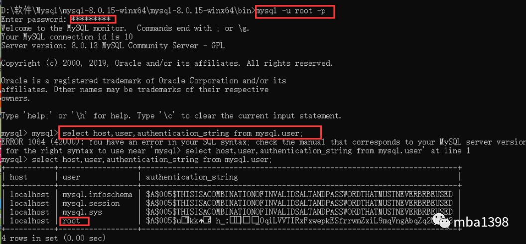 //bin目录输入命令mysql -u root -p//初始化过程中如果提示过设置了临时密码,请输入临时密码,否则直接回车//查询用户密码mysql> select host,user,authentication_string from mysql.user;