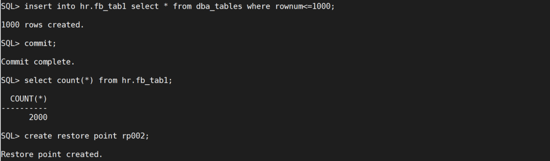 接下来,我们向这个表中添加1000条记录,认为是周二的数据情况,然后创建restore point名字为rp002。