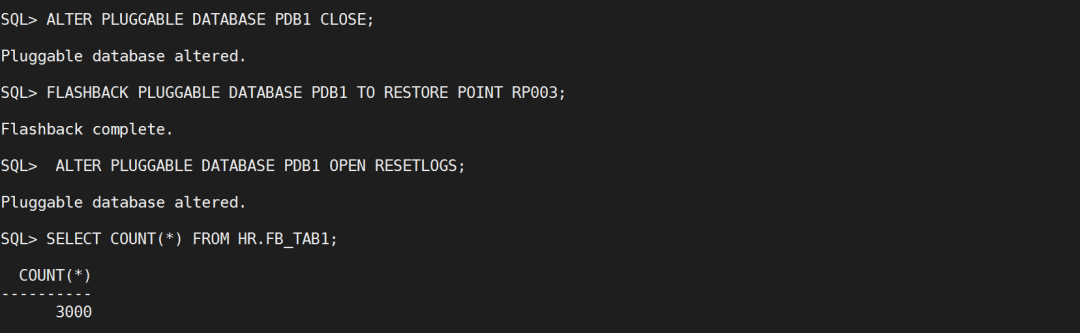 接下来,我们将PDB1关闭,然后闪回到第一个restore point:rp001,然后将数据库以resetlogs方式打开。我们通过观察,发现数据表中的记录恢复到了1000条。