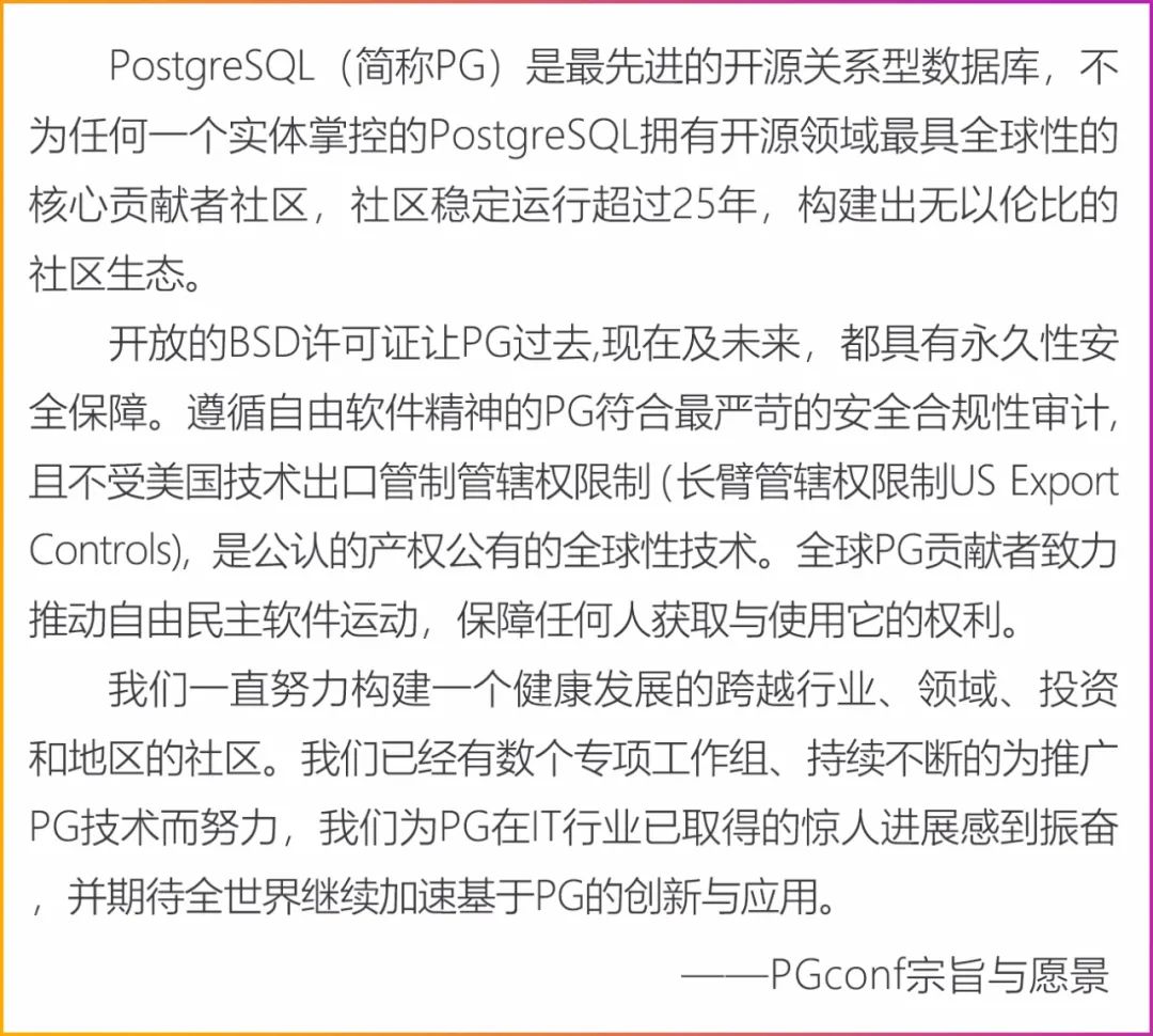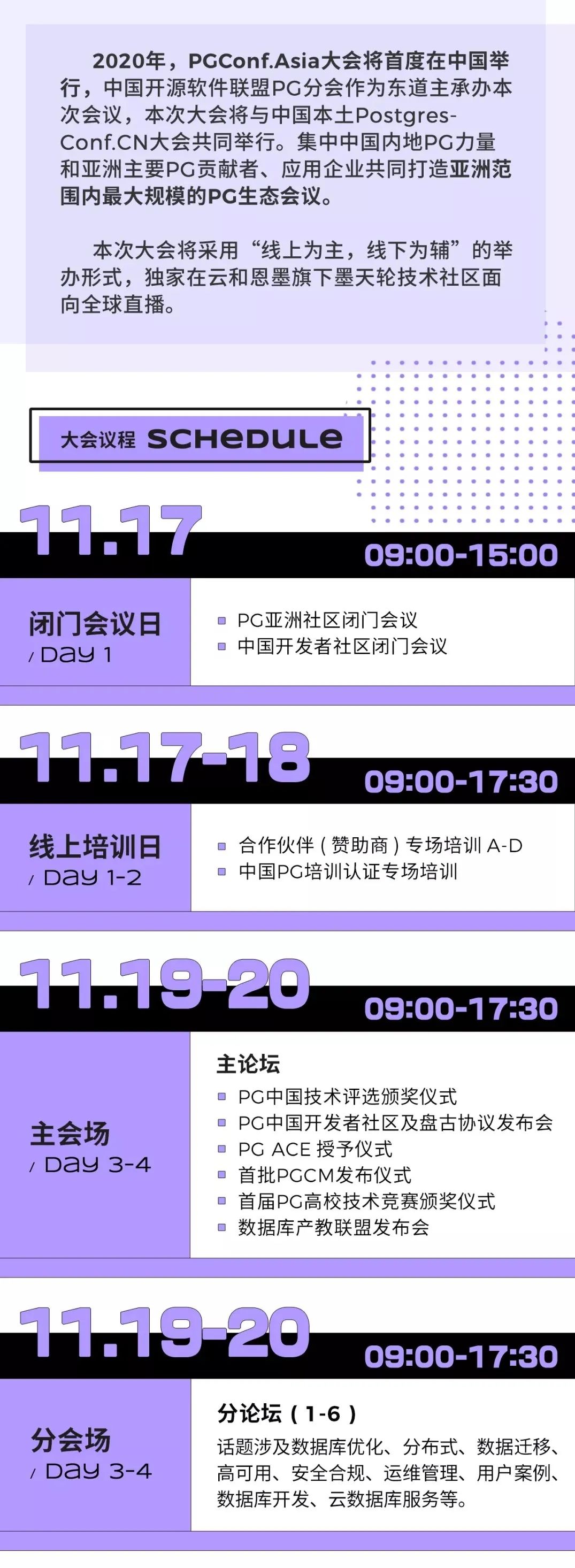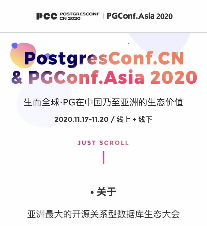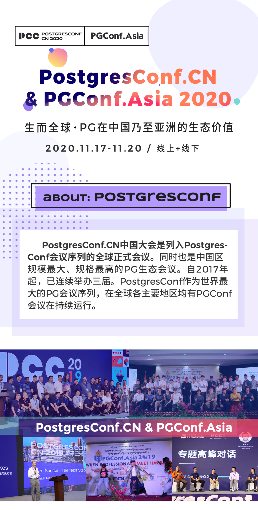 本届PGConf.Asia大会将与PostgresConf.CN中国大会联合举办。PostgresConf.CN中国大会同样是列入PostgresConf会议序列的全球正式会议,同时也是中国区规模最大、规格最高的PG生态会议,自2017年起,已连续举办三届。今年的大会将继续立足于国内PG行业,为观众提供最清晰、最独特的视角。(上届回顾:创建PG全球生态!PostgresConf.CN2019大会盛大召开)