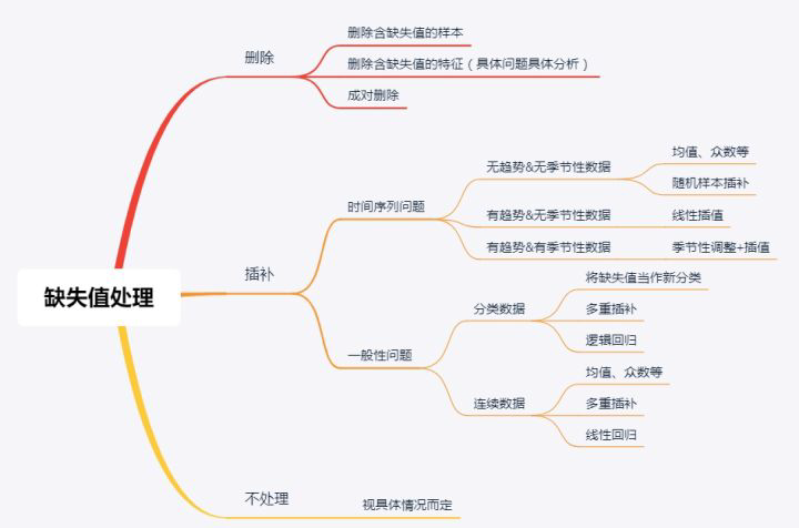 对于缺失值的处理思路是先通过一定方法找到缺失值,接着分析缺失值在整体样本中的分布占比,以及缺失值是否具有显著的无规律分布特征,然后考虑后续要使用的模型中是否能满足缺失值的自动处理,最后决定采用哪种缺失值处理方法。