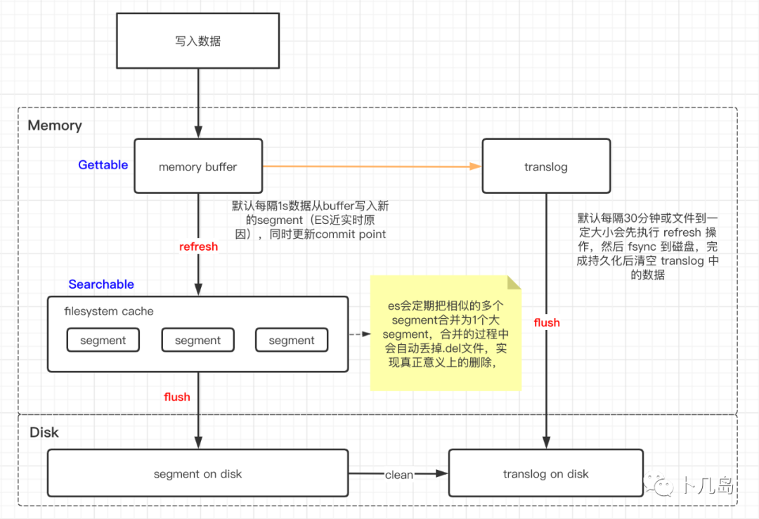 ES 默认每隔 1 秒会从内存 buffer 中的数据写入 filesystem cache,这个过程叫做 refresh。这也是为什么说 ES 是近实时搜索的原因,因为数据写入到 filesystem cache 后才会被搜索到。