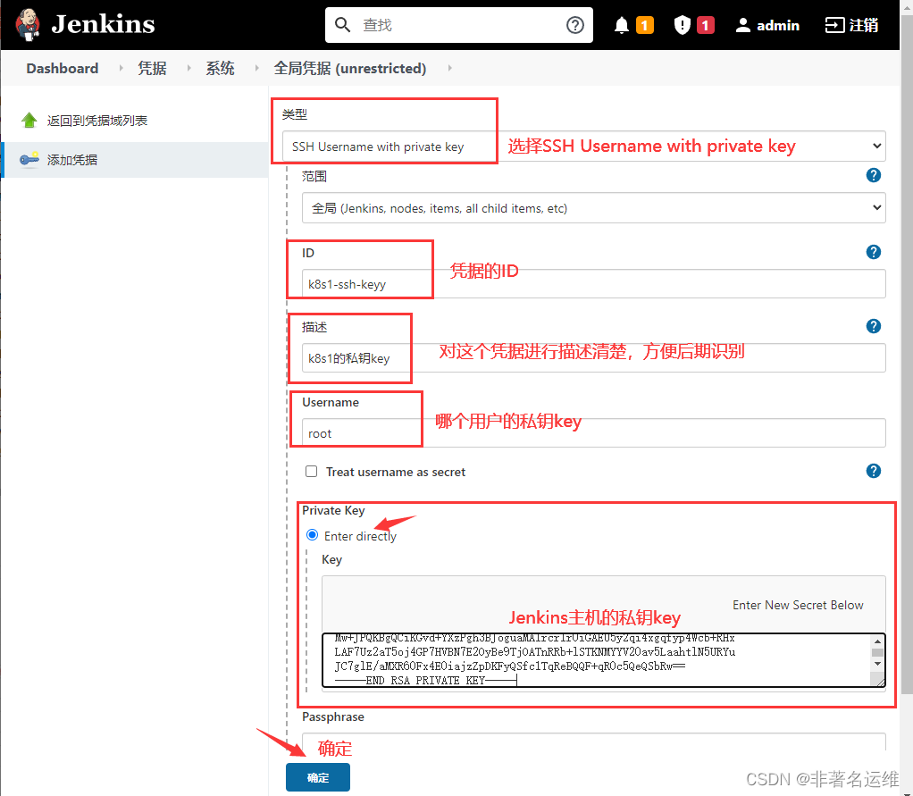 4.添加Jenkins主机SSH私钥key为凭据