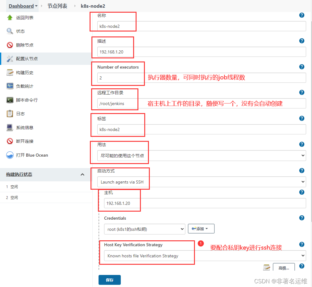 Credentials:将Jenkins本机生成的SSH密钥的公钥发送至要远程的宿主机上,并且添加Jenkins主机的私钥key为凭据进行远程连接