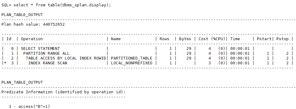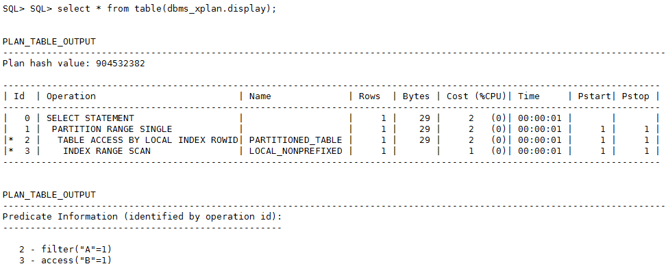 SQL> select * from partitioned_table where a = 1 and b = 1;A B DATA---------- ---------- --------------------1 1 xSQL> explain plan for select * from partitioned_table where a = 1 and b = 1;SQL> select * from TABLE(DBMS_XPLAN.DISPLAY('PLAN_TABLE'));