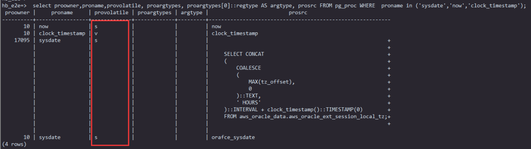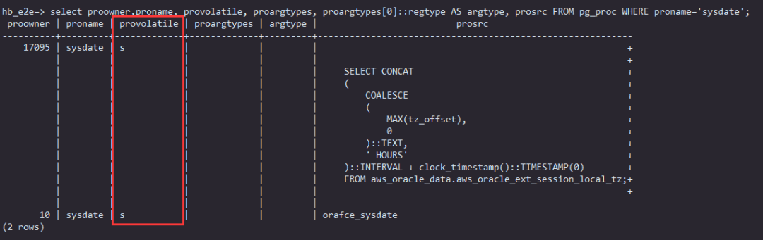 SELECT proname, provolatile, proargtypes, proargtypes[0]::regtype AS argtype, prosrc FROM pg_proc WHERE proname like ‘sysdate%’; |