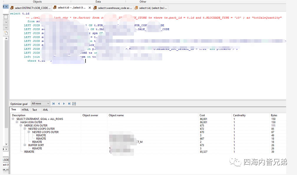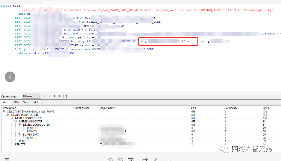 3、我一向反对多表关联,不管在什么数据库上。这次是10表关联,我其实看到也有点发怵,不懂业务逻辑下,太难评价每个环节,对还是不对,好还是不好。但是Oracle这优化器,还是准确的搞定了。为什么说这个难?比如我们写select from a,b where a.id=b.id and a.id=1;数据库不知道ab是什么。通常会改写成select from a,b where a.id=b.id and a.id=1 and b=1;因为是等价的。至于先找a.id=1 还是 b=1看哪个优了。但是他有两个选择。如果三个表呢?他有6个组合选择。即3!3的阶乘。10个表呢就是10!,10的阶乘是多大,我算不过来。这在任何数据库中都是这样。