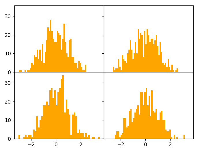 axes[i,j].hist(np.random.randn(500), bins=50, color='orange')