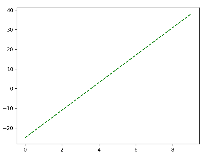 plt.plot(np.arange(10), 7*np.arange(10)-25, linestyle='--', color='g')