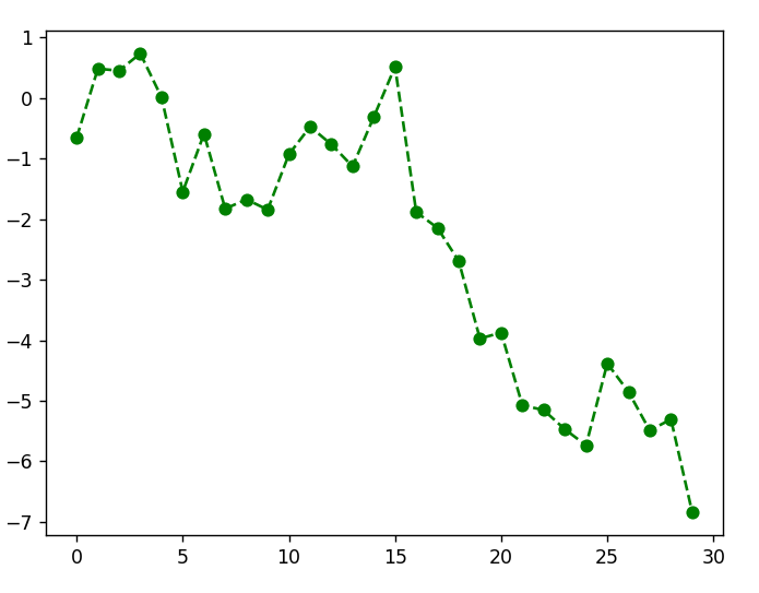 plt.plot(np.random.randn(30).cumsum(), color='green', linestyle='--', marker='o')