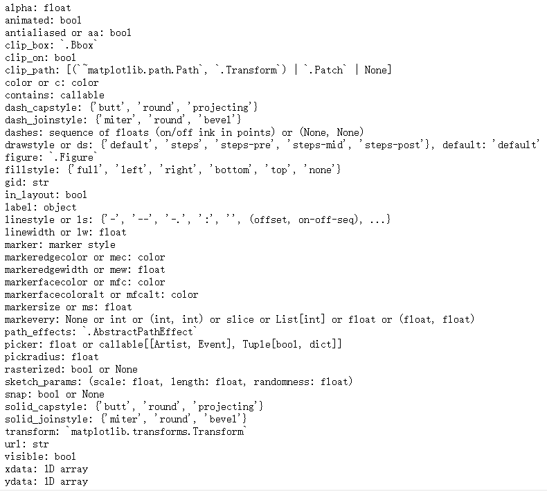 plt.plot中可以传入的参数有很多,下面这张表中都是可以控制的参数: