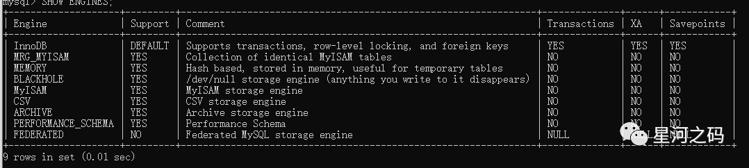 我本地使用的5.7.24版本,使用以下命令可以查看当前数据库支持的引擎信息: