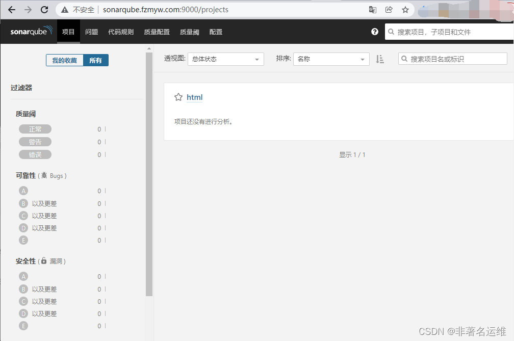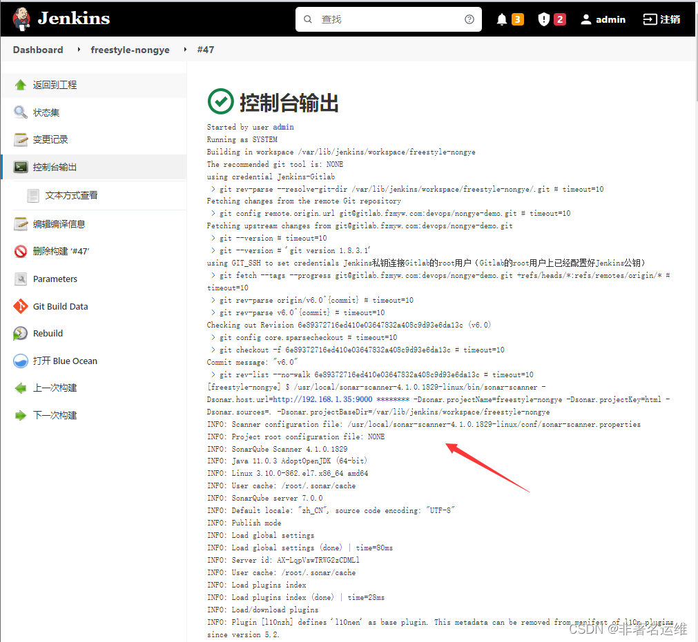 -手动从Gitlab仓库获取代码,进入项目目录.使用sonar-scanner迸行代码扫描[root@Jenkins sonar-scanner]# cd /var/lib/jenkins/workspace/freestyle-nongye #进入项目目录(html语言静态项目)[root@Jenkins freestyle-nongye]# /usr/local/sonar-scanner/bin/sonar-scanner -Dsonar.projectKey=html -Dsonar.sources=. -X #手动对项目代码进行质量分析扫描,项目代码路径为.当前路径下17:03:30.633 INFO: Scanner configuration file: /usr/local/sonar-scanner-4.1.0.1829-linux/conf/sonar-scanner.properties17:03:30.634 INFO: Project root configuration file: NONE17:03:30.658 INFO: SonarQube Scanner 4.1.0.182917:03:30.658 INFO: Java 11.0.3 AdoptOpenJDK (64-bit)17:03:30.658 INFO: Linux 3.10.0-862.el7.x86_64 amd6417:03:30.802 DEBUG: keyStore is :17:03:30.802 DEBUG: keyStore type is : pkcs1217:03:30.802 DEBUG: keyStore provider is :17:03:30.802 DEBUG: init keystore......17:03:30.803 DEBUG: init keymanager of type SunX50917:03:30.949 DEBUG: Create: /root/.sonar/cache17:03:30.958 INFO: User cache: /root/.sonar/cache17:03:30.958 DEBUG: Create: /root/.sonar/cache/_tmp17:03:37.869 INFO: Note that you will be able to access the updated dashboard once the server has processed the submitted analysis report17:03:37.869 INFO: More about the report processing at http://192.168.1.35:9000/api/ce/task?id=AX-M0Y1_K1PbXHMf8HZS17:03:37.869 DEBUG: Report metadata written to /var/lib/jenkins/workspace/freestyle-nongye/.scannerwork/report-task.txt17:03:37.870 DEBUG: Post-jobs :17:03:37.872 INFO: Task total time: 5.981 s17:03:38.003 INFO: ------------------------------------------------------------------------17:03:38.003 INFO: EXECUTION SUCCESS17:03:38.003 INFO: ------------------------------------------------------------------------17:03:38.003 INFO: Total time: 7.398s17:03:38.043 INFO: Final Memory: 7M/114M17:03:38.043 INFO: ------------------------------------------------------------------------