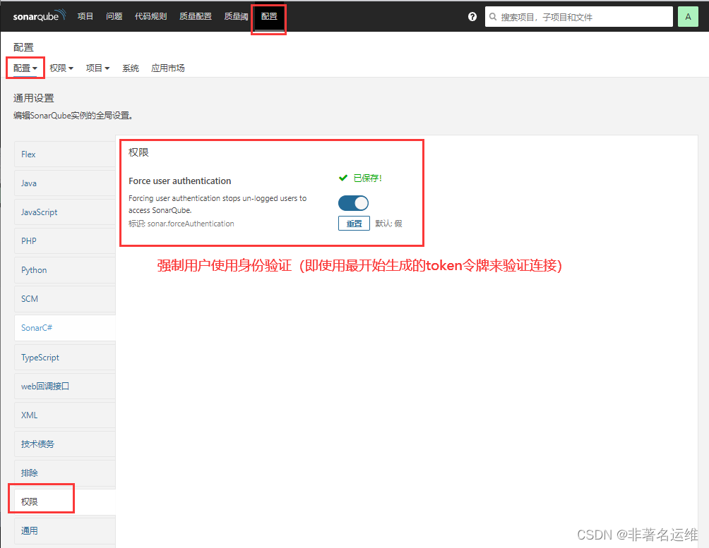 [root@Jenkins sonar-scanner]# vim conf/sonar-scanner.properties#----- Default SonarQube serversonar.host.url=http://192.168.1.35:9000 #指明SonarQube的服务端sonar.login=c47b75a7472252f85c5da08428b85e4d575219cf #添加刚才在SonarQube系统界面生成的Jenkins的token令牌(开启用户验证需要提前在SonarQube系统界面权限出开启“强制使用身份验证”,后面进行代码质量分析时可以不用在命令行添加token命令,因为配置文件已经写好了)#----- Default source code encodingsonar.sourceEncoding=UTF-8 #SonarQube字符集