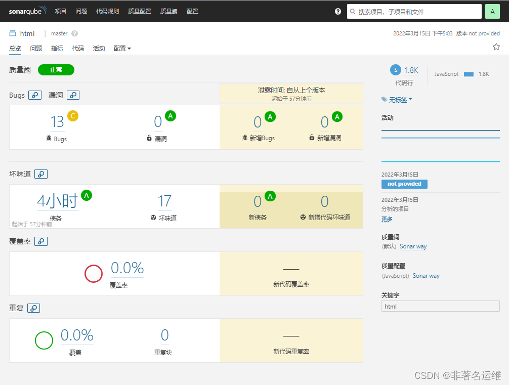 一个项目如果使用了java、css、js、html等语言,那么默认情况下仅会检测java、js等代码的漏洞和bug,因为未安装另外2个语言的代码质量分析插件,所以不分析这2个语言的质量。