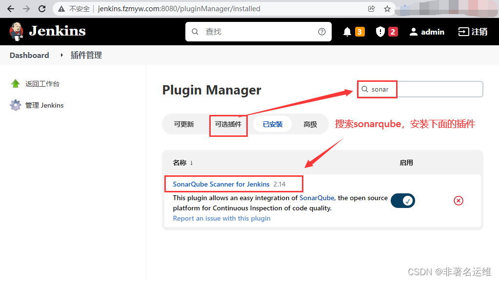 -插件安装。系统管理-->插件管理-->搜索SonarQube Scanner for Jenkins插件安装