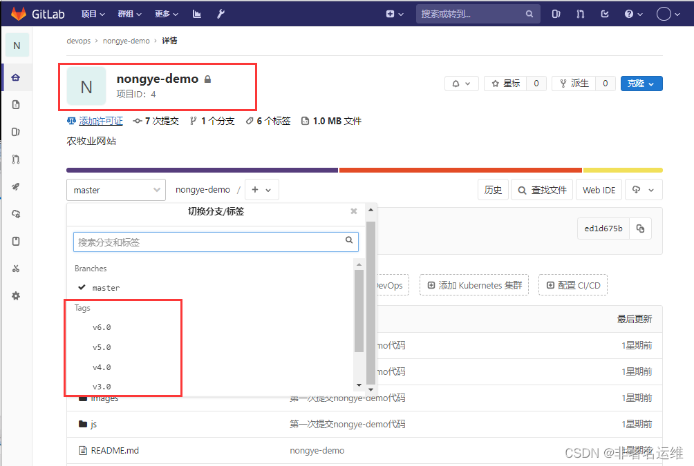-开发修改代码提交新的tag版本至Gitlab[root@Gitlab ~]# cd nongye-demo[root@Gitlab nongye-demo]# vim index.html[root@Gitlab nongye-demo]# git add .[root@Gitlab nongye-demo]# git commit -m "v6.0"[root@Gitlab nongye-demo]# git tag -a "v6.0" -m "v6.0"[root@Gitlab nongye-demo]# git push origin v6.0