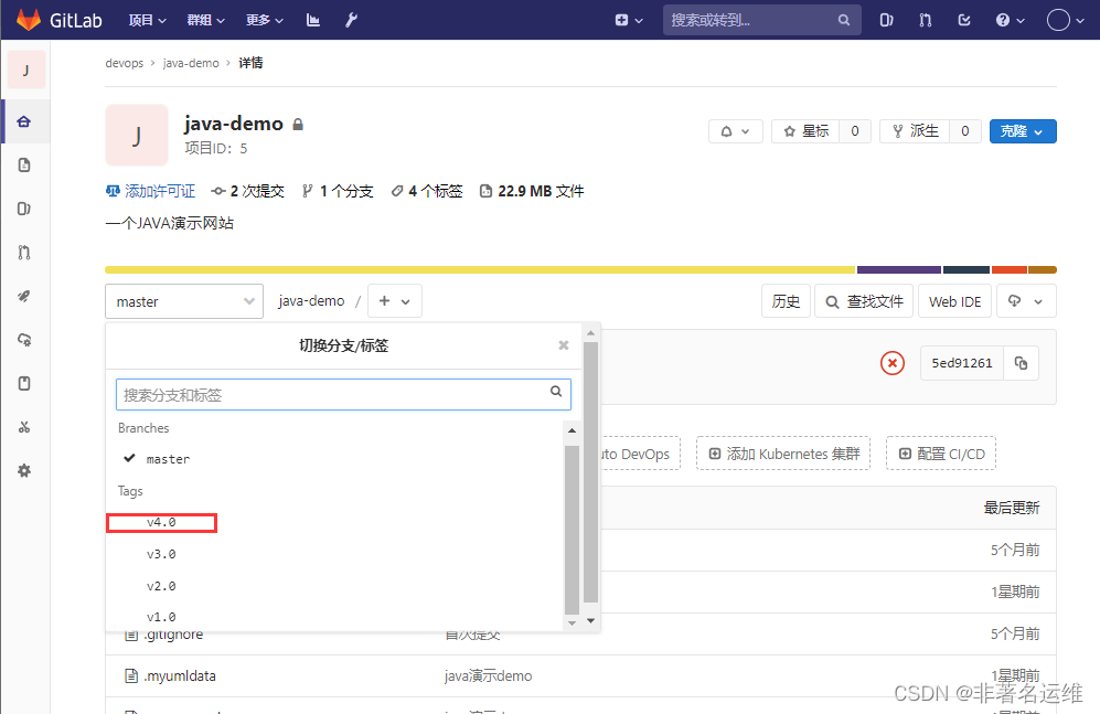 [root@Gitlab ~]# cd company/[root@Gitlab company]# echo "提交v4.0版本代码" >> README.md[root@Gitlab company]# git add .[root@Gitlab company]# git commit -m "v4.0"[root@Gitlab company]# git tag -a "v4.0" -m "v4.0"[root@Gitlab company]# git push origin v4.0