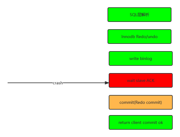(2)日志已经传输到从库上,完成了wait slave ack,此时发生crash;应用端此时并没有接收到主库返回OK。