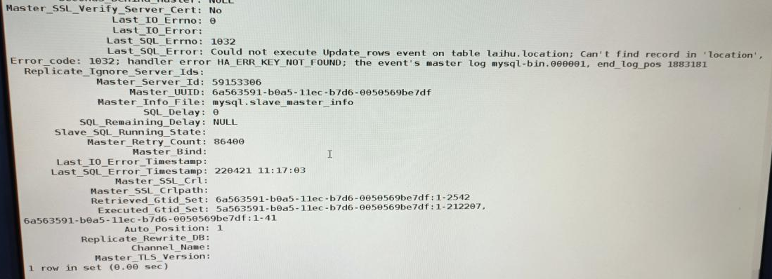 分析:A库依然比B库多了一个事务,且报错也是1032,解析原当前主库B库该位点的binlog,是一条update信息,而该表在A库中是空表,所以报错:1032错误要更新的数据不存在