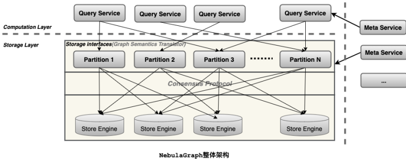 存储计算分离:在架构图中 Meta Service 的左侧,为 NebulaGraph 的主要服务,NebulaGraph 采用存储与计算分离的架构,虚线以上为计算,以下为存储。存储计算分离有诸多优势,最直接的优势就是,计算层和存储层可以根据各自的情况弹性扩容、缩容。存储计算分离还带来了另一个优势:使水平扩展成为可能。此外,存储计算分离使得 Storage Service 可以为多种类型的计算层或者计算引擎提供服务。当前 Query Service 是一个高优先级的 OLTP 计算层,而各种 OLAP 迭代计算框架会是另外一个计算层。