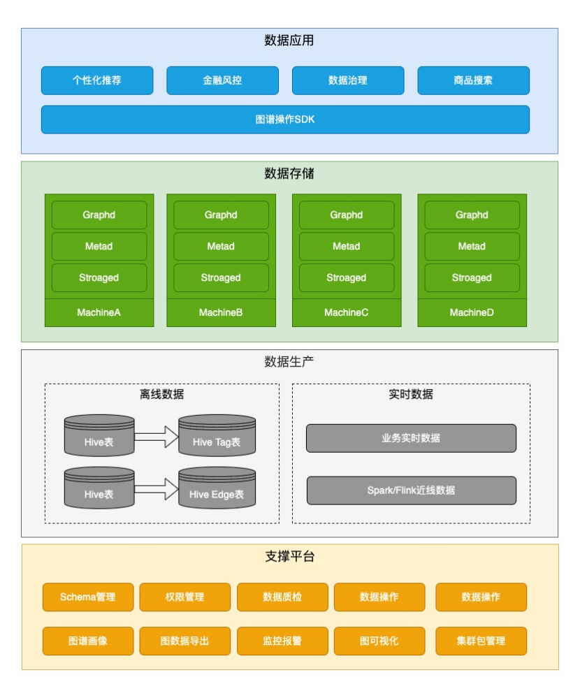 数据生产层:图数据主要有两种来源,第一种是业务方把数仓中数据通过 ETL Job 转成点和边的 Hive 表,然后离线导入到图数据库中;第二种是业务线上实时产生的数据、或者通过 Spark/Flink 等流式处理产生的近线数据,调用在线批量写接口实时灌到图数据库中。