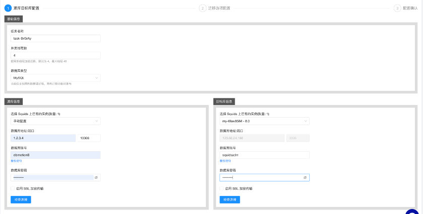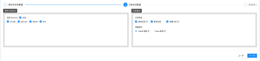添加迁移任务包括三个步骤:源库目标库配置、迁移选项配置、配置确认
