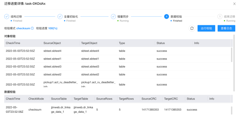 二、查看任务详情 这个阶段可以查看任务在各个阶段执行的具体情况,并且支持动态校验源端和目标端的数据是否一致