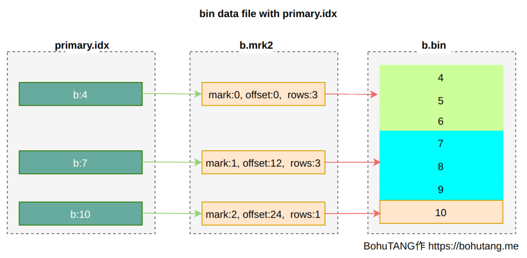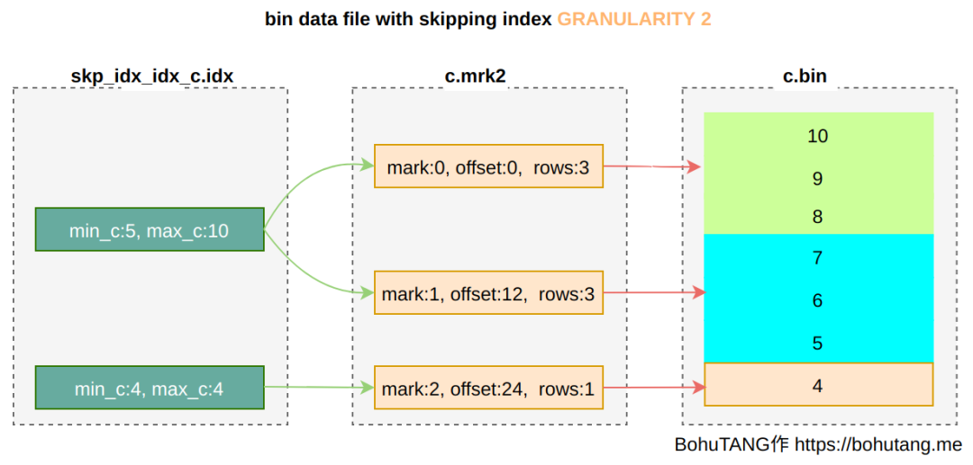 表示每 3 行数据为一个 granule,分区目前只有 7 条数据,所以被划分成 3 个 granule(三个色块):