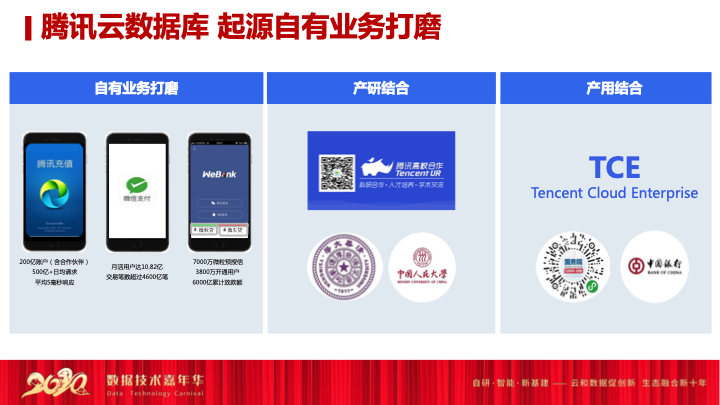 这是目前腾讯云数据库起源的大致路程,我们是从自有业务如腾讯充值和微信支付开始业务打磨,到后来产研结合和产用结合,直至目前在各个行业,包括像金融和政府这种传统行业。首先我们讲一讲自有业务的打磨,腾讯是一家重视产品体验的公司,或者是产品驱动型的公司。腾讯每年度都有一个大奖,叫做名品堂。大家听说过的一些国民应用,比如像微信、微信支付、王者荣耀、全民K歌,都是每年名品堂的明星产品。腾讯云数据库也在时时刻刻支持这些名品堂产品的演进。今天我举三个名品堂的例子,去看看腾讯云数据库怎么去做支撑在内地的孵化。