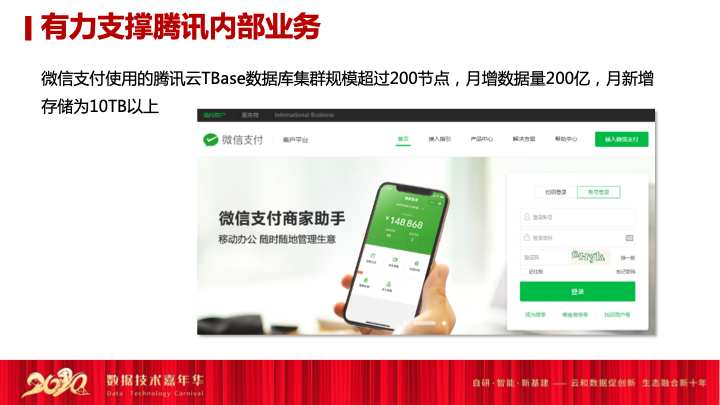 第一个是微信支付,腾讯云数据库有力地支撑了微信支付的使用,目前腾讯云数据库的产品TBase就在支持微信支付的商家业务库,我们自动地帮商家业务支付库做分离,目前整个集群规模超过200个节点,月增数据量也超过两百亿,保证微信支付能够平缓的运行在业务端,底层就要靠腾讯云数据库团队来对内部业务做支撑。
