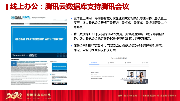 我们看内部第三个系统我们怎么支撑的,腾讯会议可能是今年疫情之后发展非常快的一款会议级的产品,目前应该是国内第一家最快突破一亿级用户的会议系统,现在腾讯会议还不是腾讯名品堂的产品,我相信可能只是一个时间的问题,应该也会是腾讯名品堂第一个最快成为名品堂产品的to B产品。腾讯会议在疫情之后,每周都有数万家企业跟政府相关机构在使用腾讯会议复工复产,通过腾讯会议进行云签约、云招标、云面试、云培训,我相信可能我们在座的朋友可能在日常办公中也在用腾讯会议开会和沟通。目前腾讯云数据库也在支持腾讯会议,为整个会议的高速流畅、稳定可靠提供服务。会议系统的登录信息、认证信息、支付信息,包括所有合规信息,全部都存在腾讯云的系统之上,我们的团队也在支撑腾讯会议目前所有线下的突破。