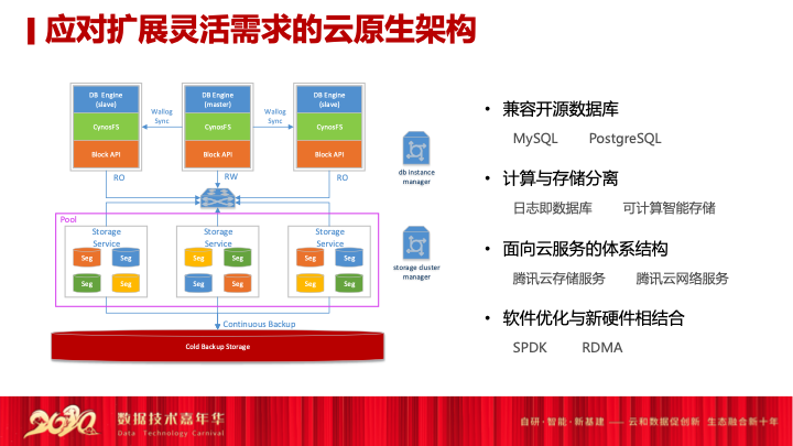 第二个点,刚才讲腾讯在2018年正式进入产业互联网,其实腾讯进入产业互联网,我个人理解它是相对一些友商时间短慢了一点。其实腾讯在整体TO B策略上也是C2B的打法,利用好一云四端。利用好腾讯云的底座,利用腾讯自己的好多端,微信、企业微信和QQ等多端的抓手来触碰更多的企业客户,另外我们启动了像目前的小程序、云开发,包括再去启动SaaS加速器,通过小程序能够连接更多各行各业优秀的SaaS,在腾讯云之上构建一套全站产业互联网打法。基于小程序这样的优势连接好端,其实我们今天也在重构云开发,或者说重构开发者的场景。通过开发者的场景来看,其实使用数据库就要逐渐从资源使用调度使用,基于这样的场景在小程序和云开发就有很强烈的需求,就是数据库要向SQL化转变,将数据进行解耦。如果你的内存跟你的计算资源和你的存储是在一起绑定的,你就永远无法实现动态的SQL化,基于这样的需求和整个的趋势,我们构建了扩展灵活的云原生架构,我们将计算跟存储做分离,通过标准的协议可以将日志下沉到底层的存储层,存储层感知逻辑跟应用,在存储层回放,能够实现计算跟存储解耦之后,计算就可以做到秒级的扩容,秒级的增删处理,秒级应对资源做上下游的扩容分配或者加配,这样就可以对接云开发的场景,可以实现SQL化,这是腾讯云在各行各业的突破,做的两点核心功能和布局,包括我们在互联网行业能够做一个有效的业务突破,明确取得市场份额。