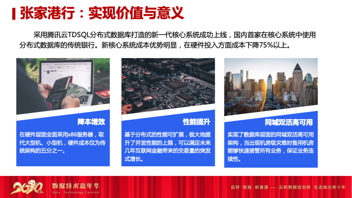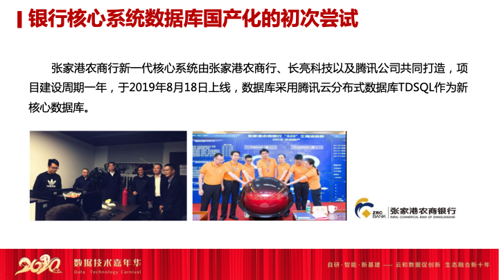 我们第一家的拓展公司是张家港农商行,这家农商行是在江苏,他们在做新一代核心的替换,当时是从应用系统核心一直到数据库核心全部替换,底层是腾讯云的数据库,我们实现了张家港农商行核心业务系统的全量替代,这个也是当时中国第一家实现传统银行客单替换。我们当时运行了一年半,包括POC选型,然后数据库应用改造,从集中式到分布式的改造,另外还有全站数据库的压测,还有各个组件的暴力测试,包括整个应用的数据反切回数据库整体测试,保证整体的时间运行了一年半以后,2019年8月正式投产张家港农商行国产数据库的客单的替代。