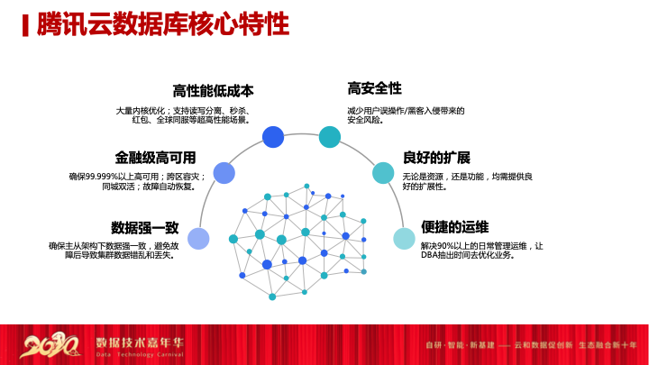 我们刚才总结,腾讯云数据库在内部系统的支撑经验,然后支持好泛互联网行业我们做的产品布局,除了这几点之外,我们总结下来,腾讯云的数据库维持六个设计的理念服务好金融行业。