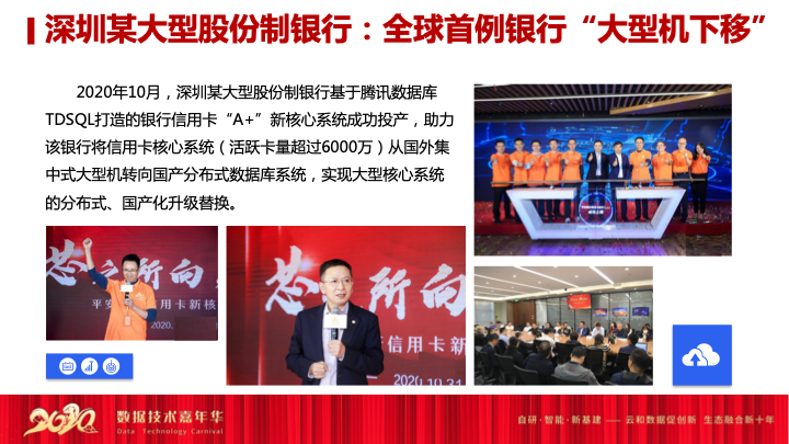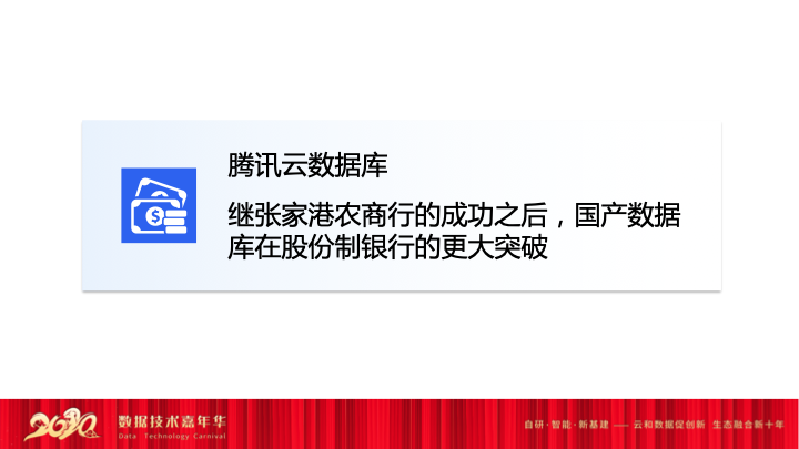 讲完了金融行业看中的这些数据库特性之外,我们最近也是在张家港农行成功之后,腾讯的数据库在股份制银行又有了一次重大的突破。