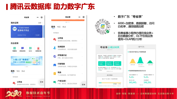 第一个例子是腾讯云数据库助力数字广东,我刚才也在开始的时候讲了趋势的变化,我们也看到广东作为GDP的第一大省,其实它在两年之前已经构建了一套自己的省政务云,它成立了一家公司叫数字广东,省政务云作为整个政务系统底层云的支撑,当你广东省内医保局、人社部有业务系统,有一些新的业务资源需要开通的时候,数字广东的模式就是必须由这些政务民生的部门在数字广东采购云的资源来进行底层的支撑。而腾讯云的数据库,完全接入数字广东这套平台,数据广东内所有的数据库系统全部由腾讯云进行支撑,现在广东的医保局和人社部想去购买资源提预算的时候,全部要通过省政务系统,所以它的底层全部由腾讯云数据库做支撑了,所以腾讯云数据库在数字广东这个体系内,也为像医保局和人社部这样核心的应用做支撑,我们提供的OLTP+OLAP这些分析能力,保证数字广东能够在广东省政府数字化转型中,在全国排名能做到最高的模式。