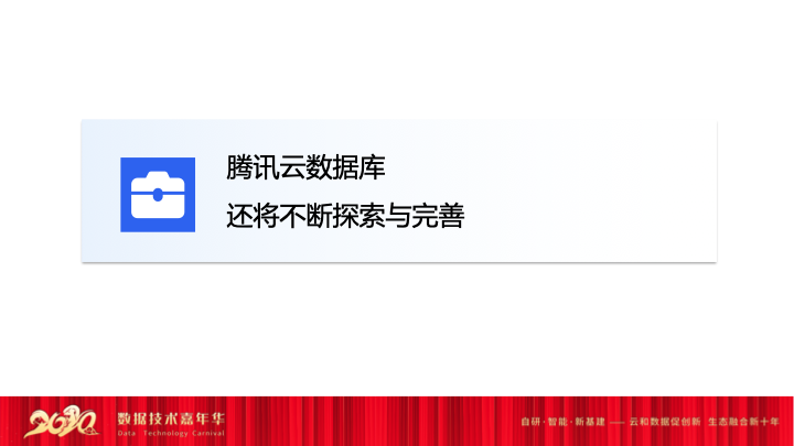 最后,我想讲腾讯云数据库基于这么多年从内部走出来,服务这些明星的名品堂应用,再到服务好腾讯泛互联网的朋友圈,再逐步到金融跟政务行业的服务,其实腾讯云数据库还将不断地探索跟演进。目前腾讯云数据库将沿着自己的主航道继续的演进,以前的数据库或者刚做云的时候,就是一种数据库+云,在原有的数据库之上加上了云的便利性。比如说数据库的便捷模式和服务模式基本不变,只是加上了云的商业模式的变化,从原来的license模式变成服务化的模式,其实更多的是在借助云计算商业上的便利提供云数据库。