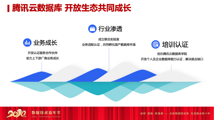 另外腾讯云数据库也会继续开放生态的共同成长,目前我们也是在三个方面来做生态的拓展。第一个就是在业务成长层面,我们也是开发了认证服务合作伙伴的体系,我们上下游有很多服务合作伙伴,跟我们一起做基于腾讯云服务的拓展,我们也努力助力上下游厂商的成长。另外就是行业的渗透,我们现在也成立了联合实验室,我们在跟各行各业ISV集成商,腾讯云承担所有的认证成本,来跟用户进行上下游的适配,去共同孵化国产数据库的环境。最后就是培训认证,我们创造了腾讯数据库学院,在开发个人及企业的数据库能力认证,也逐渐解决就业的缺口。接下来我想说国产数据库已经到了一个数据库的春天,我们今天也看到了这么多优秀的企业进入国产数据库赛道,阿里、腾讯、华为、中兴、蚂蚁这样优秀的企业,都在进入国产数据库赛道,证明春天已经到来。另外今年我们也看到了很多数据库厂商,已经进入了Gartner象限,不久也会看到。我们也看到了今年我们贵州出现了单一数据库采购历史上最大的单,我们也看到了最近出现了单轮数据库融资额最高的历史。种种迹象证明,国产数据库的春天已经到来,所以我们希望所有上下游的同仁,我们一起努力去营造一个良好的竞争环境,来共同地打造国产数据库之光。谢谢大家!手机运维小程序——腾讯云数据库上线啦,从此在手机里可以实现实例信息查看,健康报告接收,慢SQL分析和异常查看等功能,以后回家终于可以不背电脑了!