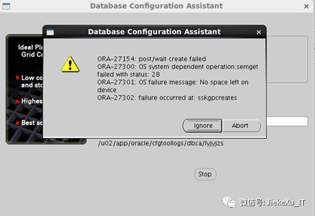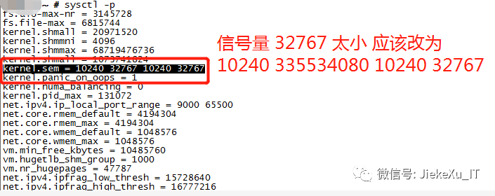 [root@JiekeXu ~]$ ipcs...----- Semaphore Arrays --------key semid owner perms nsems0x21b9674c 196610 oracle 660 1270x21b9674d 229379 oracle 660 1270x21b9674e 262148 oracle 660 127...If we assume this is the case here.假如我们遇到的是这种情况,So, here, the actual semaphore accommodated per array is not 250, it is 127.这说明每个数组中不是250,而是127,So, practically, only 16256 (128*127) can present in the server.所以只有16256个可用的信号量,这也就是我们计算processes总量远远未达到32000,但是依旧报错的原因,Solution解决方案:kernel.sem = 250 32000 100 128 ---- >>>> This indicates that 250 semaphores can be accomodated in an array and maximum of 128 arrays can be in the system.So, in total, 32000 (250X128) semaphores can present in the system.Thus We need to increase the maximum number of arrays that can be present on the server.Kindly follow the below steps :-----------------------------------1. Query the current semaphore values in the kernel# sbin/sysctl -a | grep sem2. Modify SEMMNI value in the etc/sysctl.conf.Fromkernel.sem = 250 32000 100 128Tokernel.sem = 250 32000 100 2003. # sbin/sysctl -p这里建议的是将kernel.sem修改为250X200,,但是中间的32000未改变,但是根据在support.redhat.com 上的文档How to increase the number of semaphores:将sysctl.conf中设置为kernel.sem = 250 64000 100 256并sysctl -p ,解决该问题。