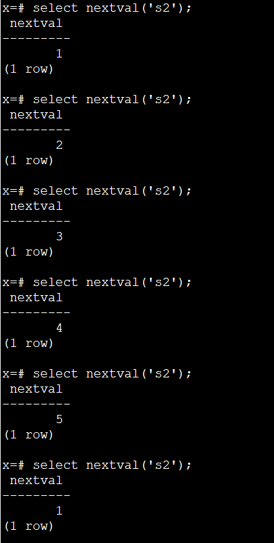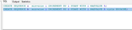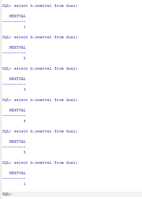 create sequence b increment by 1 minvalue 1 maxvalue 5 start with 1 cycle;