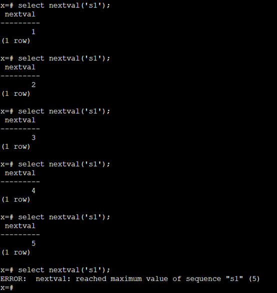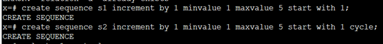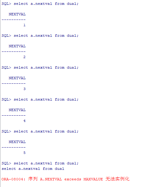 create sequence a increment by 1 minvalue 1 maxvalue 5 start with 1;