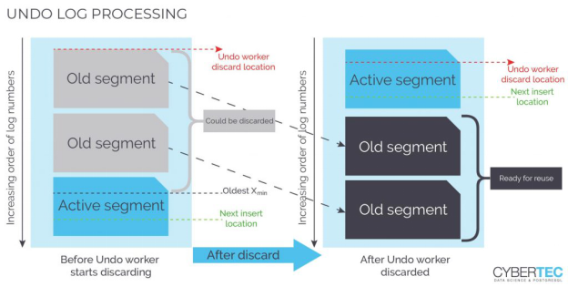 为了确保这个事务执行正确,UPDATE不能只是覆盖旧的值并且丢弃它们。有两个理由:首先,我们需要支持并发,数据在被修改时其他用户要能读取。其次就是更新一条记录并不意味着它一定被commit,因此我们需要一种有效的方式来处理rollback。经典的PostgreSQL存储格式会在标准表中复制一条记录从而导致上面提到过的所有膨胀相关的问题。Zheap处理这事有一点不同:数据更新发生时,系统通过记录“undo“信息来处理事务可能因为任何原因被终止。这是基本的概念也适用于INSERT,UPDATE和DELETE,我们可以逐一看下这些操作中它是如何工作的:INSERT:增加行