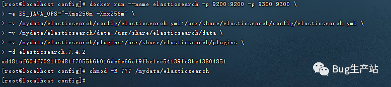 # 启动 elasticsearchdocker run --name elasticsearch -p 9200:9200 -p 9300:9300 \-e ES_JAVA_OPS="-Xms256m -Xmx256m" \-v /mydata/elasticsearch/config/elasticsearch.yml:/usr/share/elasticsearch/config/elasticsearch.yml \-v /mydata/elasticsearch/data:/usr/share/elasticsearch/data \-v /mydata/elasticsearch/plugins:/usr/share/elasticsearch/plugins \-d elasticsearch:7.4.2