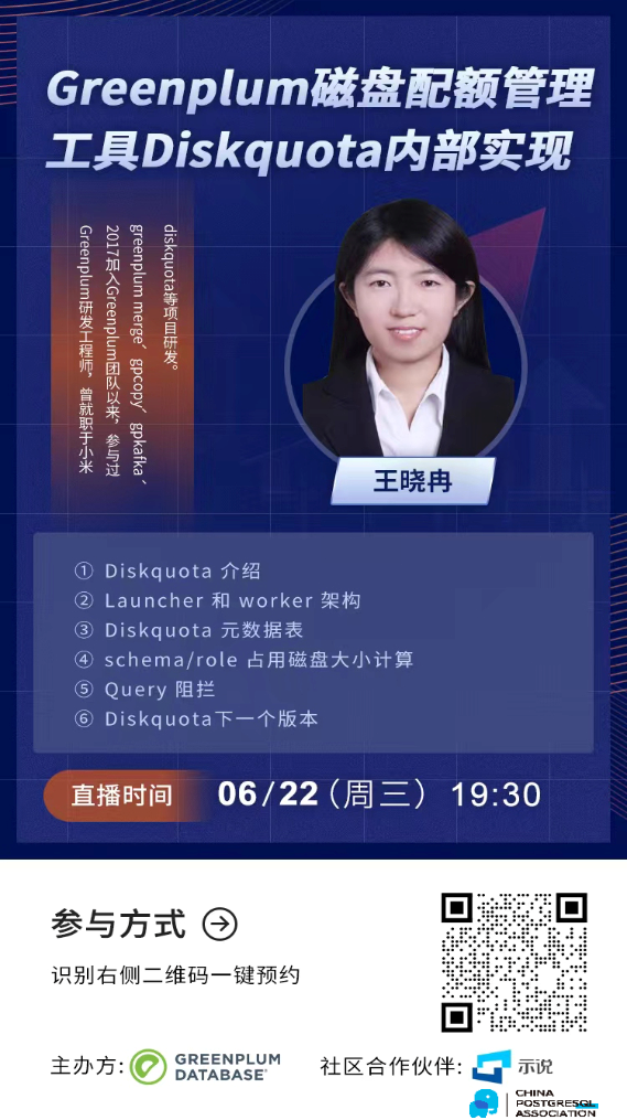 如何增量收集表占用磁盘空间大小,以及如何拦截超出限额的 query 来深入了解 Diskquota 的内部实现,并将在活动分享