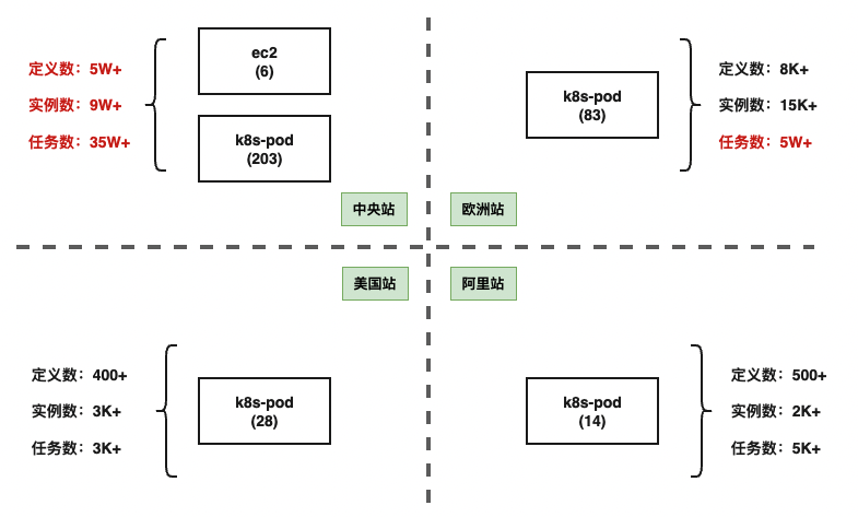 中央站我们部署了6台虚拟机,K8S Pod 203个,定义的DAG定义数量5w+,每天运行DAG实例数9W+,每天运行35w+任务数。欧洲站每天任务数5w+,美国站和阿里占两个站点数仓业务正在迁移中,当前任务较少。