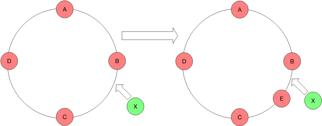 如图所示,假设原始有4个分片(图1)。当添加一个节点后,它会导致某一部分的key本来是写到nodeC上而现在会被写到nodeE上,也就是无法命中之前的节点。从客户端的角度来看,key就像是丢失了。而变动的节点越多,key丢失的也越多,假设某个集群从10分片直接添加到20分片,它直接会导致50%的key丢失。删除一个节点同理,就不再赘述。因此尽管一致性hash是个比较简单优秀的集群方案,但无法直接水平扩容一直困扰着运维和架构团队。为此,CRedis团队在2019年提出了水平拆分的方案。CRedis水平分拆的思路比较朴素,因为在一致性hash同一个水平位置增加节点会导致数据丢失,那么不改变原来层次节点的hash规则,以某个节点为hash的起点,再来进行一次一致性hash,演变成树的结构(图2)。